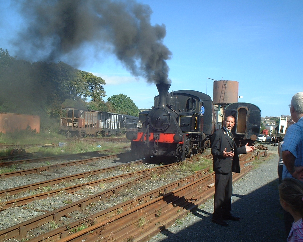 4 - A tour guide takes visitors around the sheds at Downpatrick on Northern Ireland's Downpatrick and County Down Railway while an Orenstein and Koppel built former Irish Sugar Company 0-4-0 tank steams by with a departure to King Magnus' Grave during the 2004 tourist season. - Kevin Tennent (Kevo00)